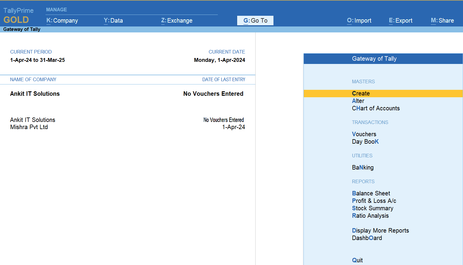 Ensure you are on the Gateway of Tally screen with the company already open.